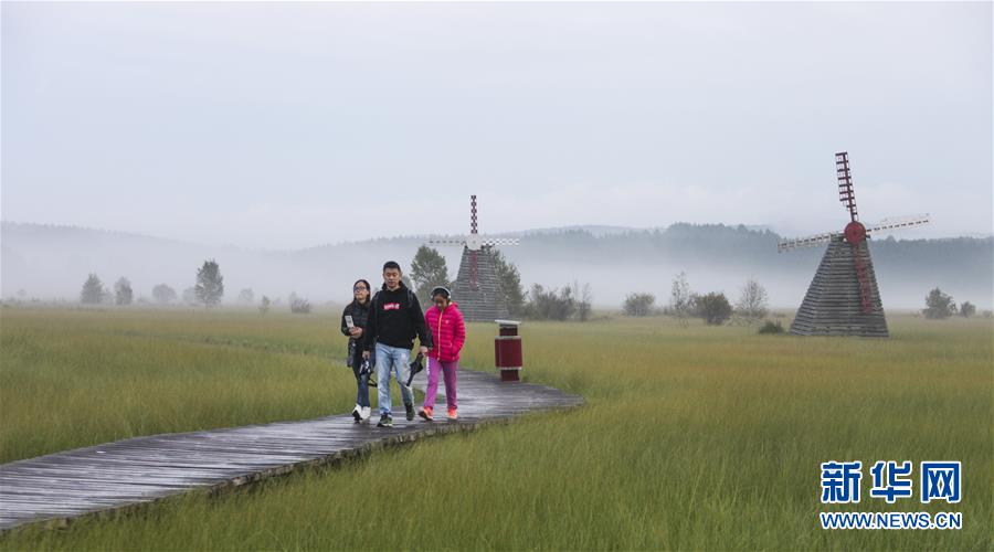 8月26日,游客在塞罕坝国家森林公园内游览。 初秋时节,位于河北省承德市的塞罕坝国家森林公园晨雾缭绕,秋意渐浓,美景如画。 新华社发(刘满仓 摄)