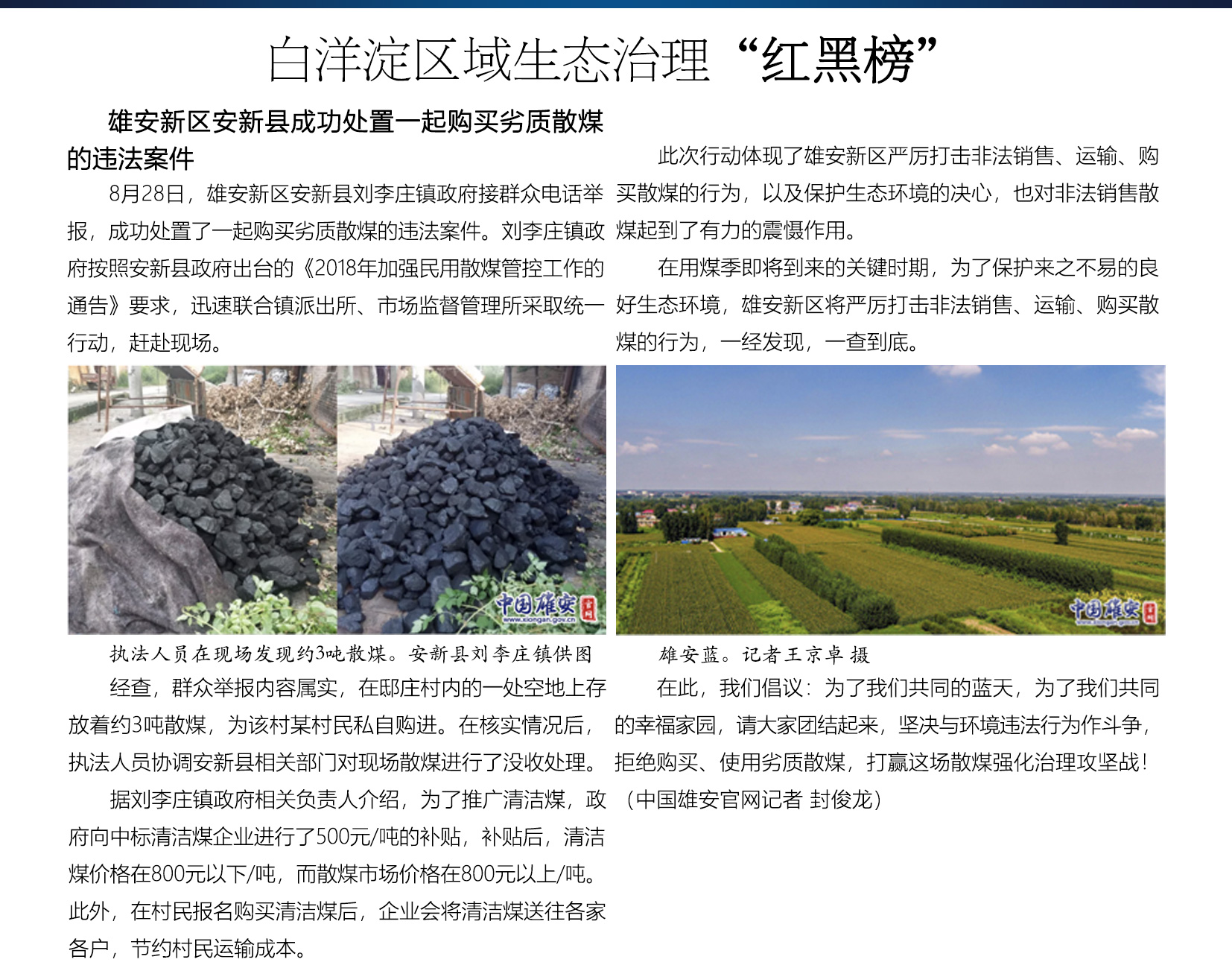 8月28日,雄安新区安新县刘李庄镇政府接群众电话举报,成功处置了一起购买劣质散煤的违法案件。