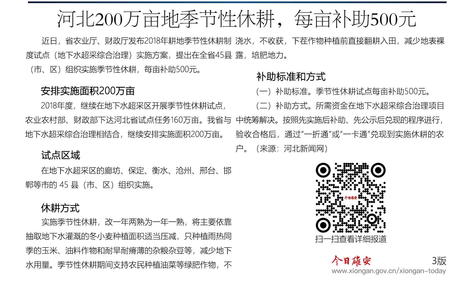 近日,省农业厅、财政厅发布2018年耕地季节性休耕制度试点(地下水超采综合治理)实施方案,提出在全省45县(市、区)组织实施季节性休耕,每亩补助500元。