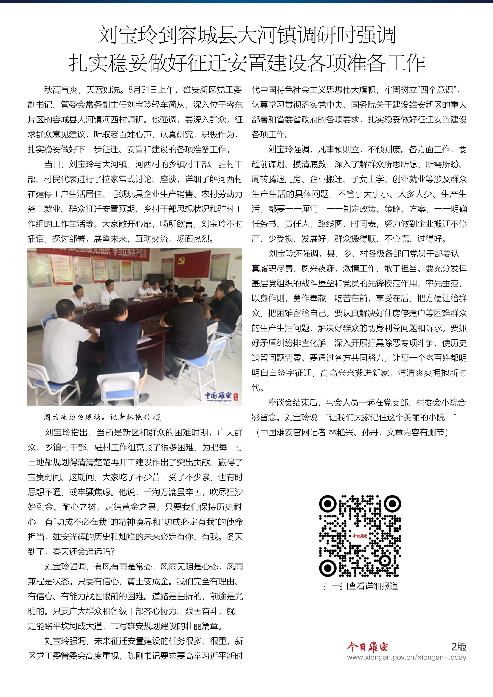 8月31日上午,雄安新区党工委副书记、管委会常务副主任刘宝玲轻车简从,深入位于容东片区的容城县大河镇河西村调研。