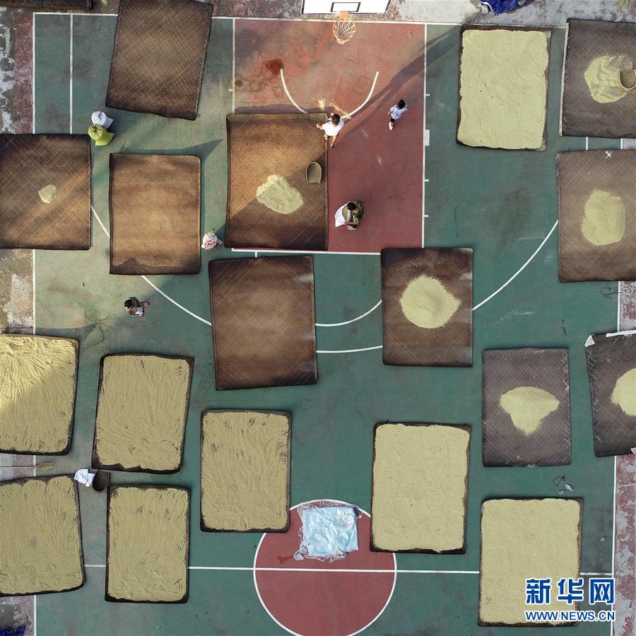 9月3日,湖南湘西土家族苗族自治州吉首市矮寨镇农民在晾晒稻谷(无人机拍摄)。
