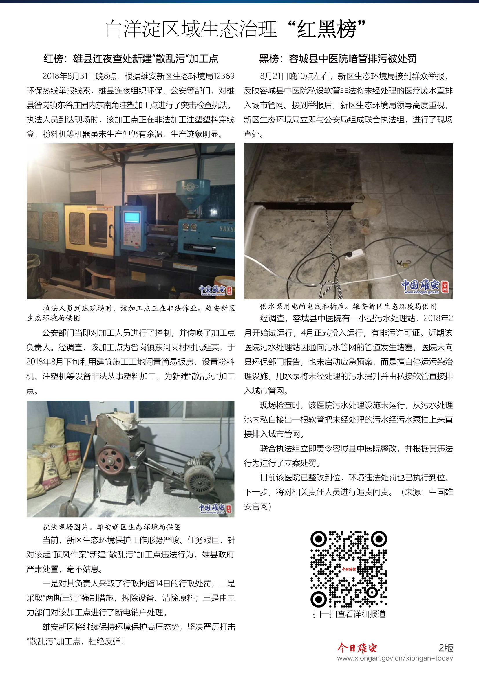 2018年8月31日20:00,根据雄安新区生态环境局12369环保热线举报线索,雄县连夜组织环保、公安等部门,对雄县昝岗镇东谷庄园内东南角注塑加工点进行了突击检查执法。