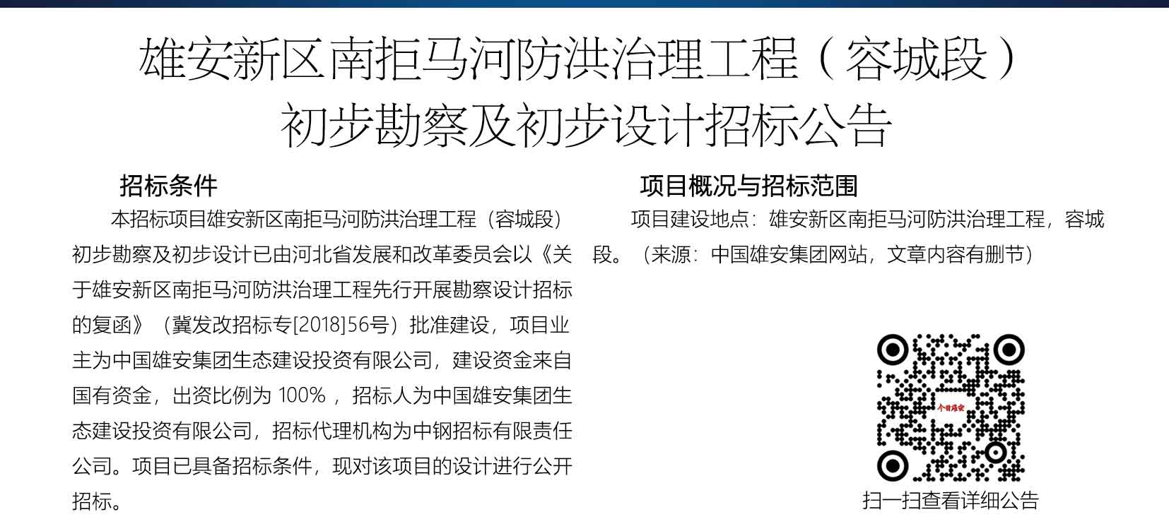 中国雄安集团生态建设投资有限公司发布雄安新区南拒马河防洪治理工程(容城段)初步勘察及初步设计招标公告。
