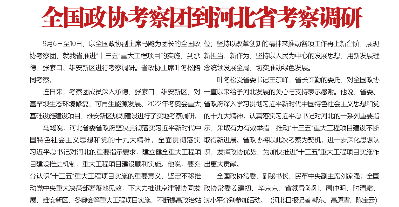 9月6日至10日,以全国政协副主席马飚为团长的全国政协考察团,就河北省推进“十三五”重大工程项目的实施,到承德、张家口、雄安新区进行考察调研。