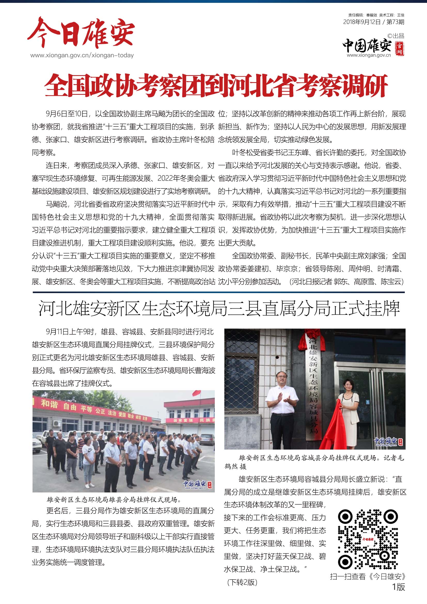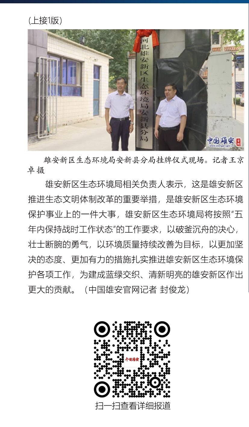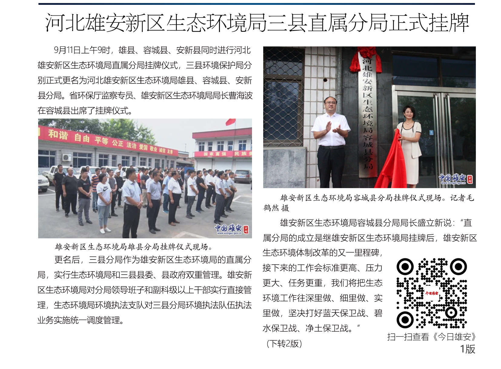 9月11日上午9时,雄县、容城县、安新县同时进行河北雄安新区生态环境局直属分局挂牌仪式,三县环境保护局分别正式更名为河北雄安新区生态环境局雄县、容城县、安新县分局。