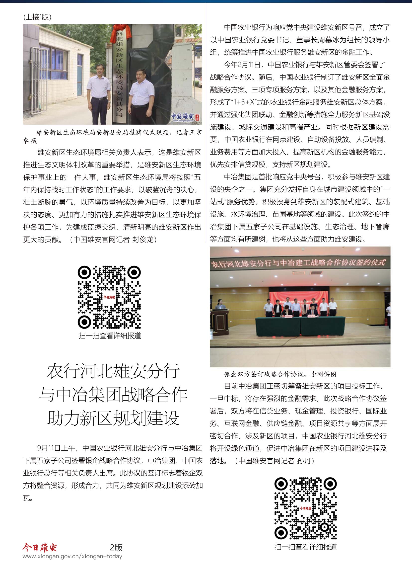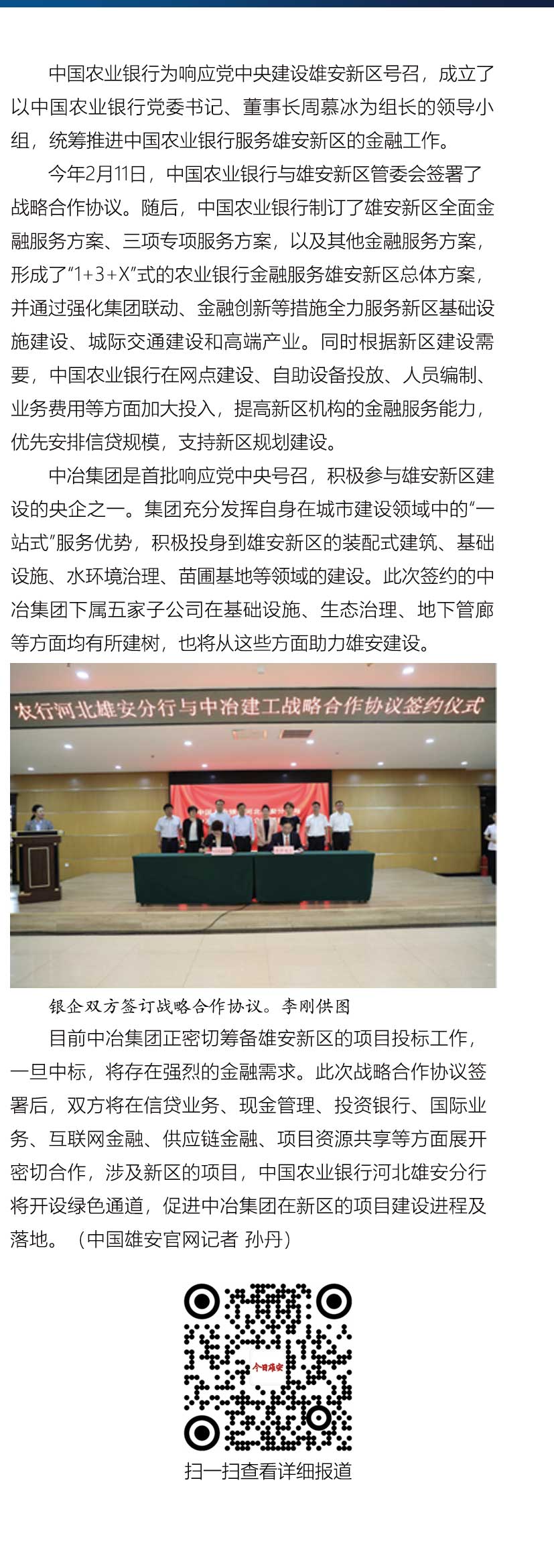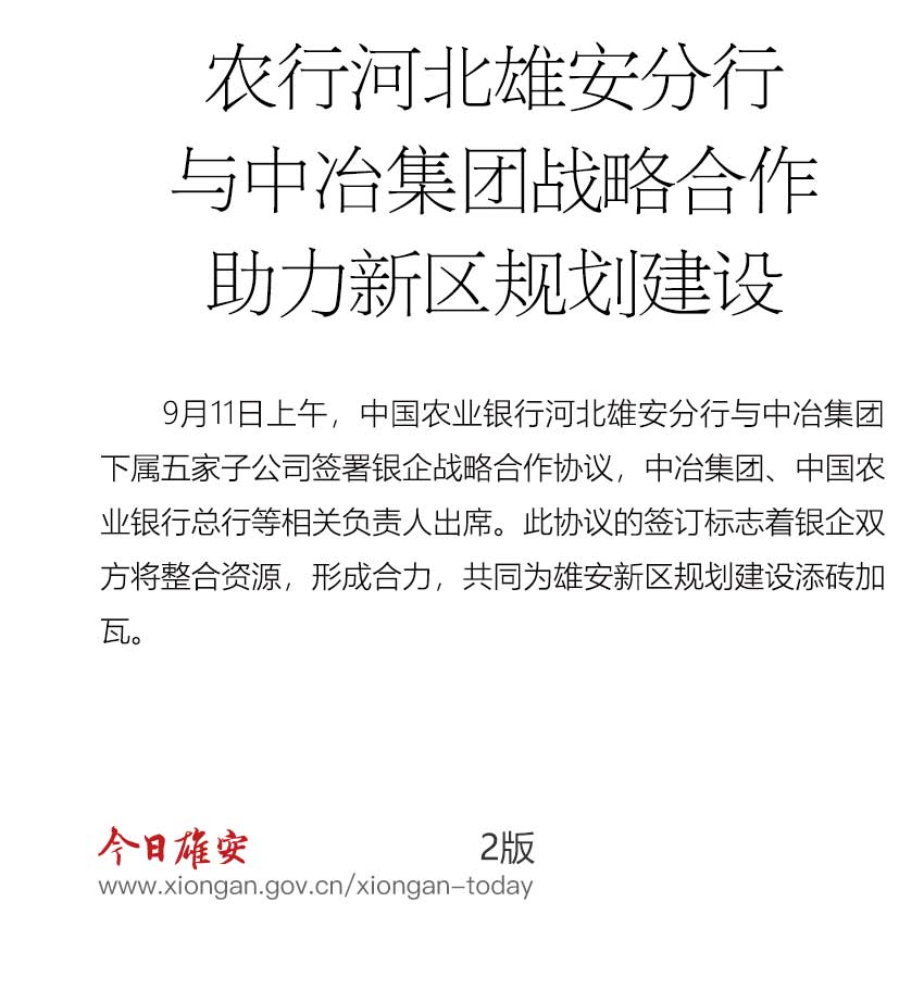 农行河北雄安分行与中冶集团战略合作 助力新区规划建设
