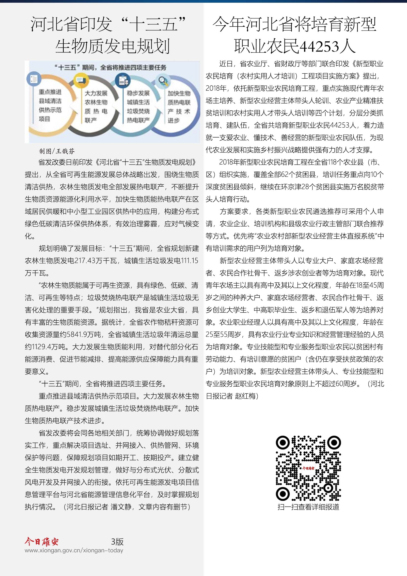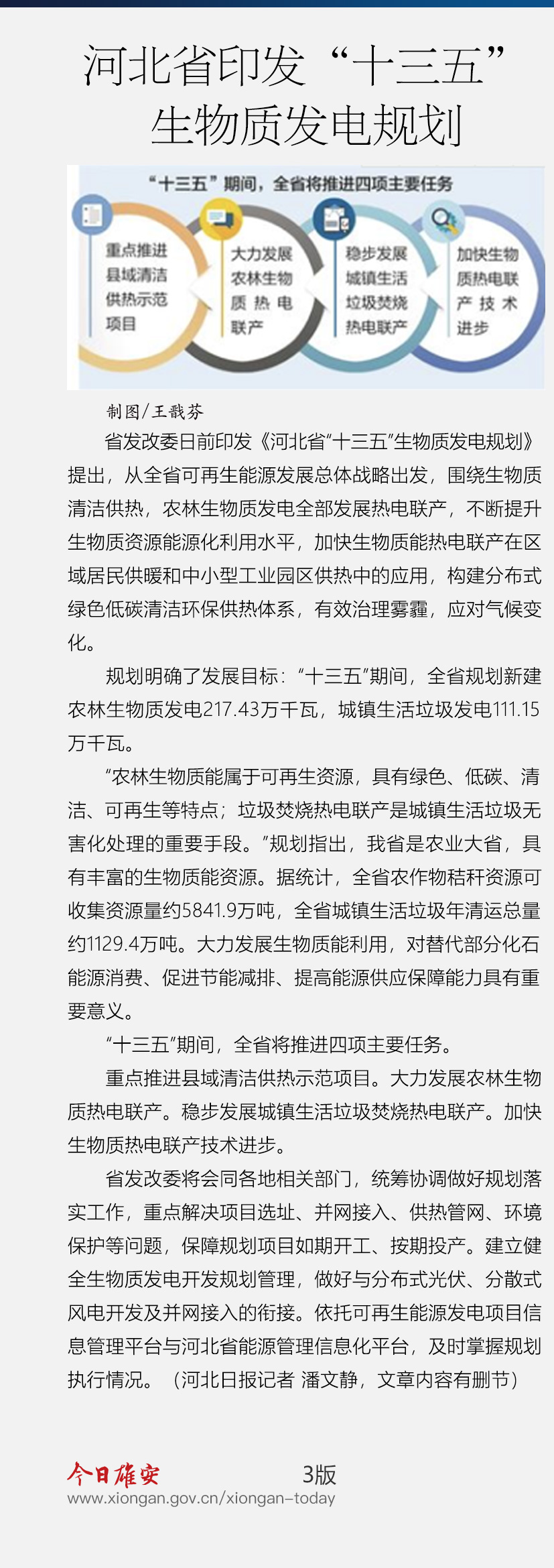 河北省发改委日前印发《河北省“十三五”生物质发电规划》提出,构建分布式绿色低碳清洁环保供热体系,有效治理雾霾,应对气候变化。