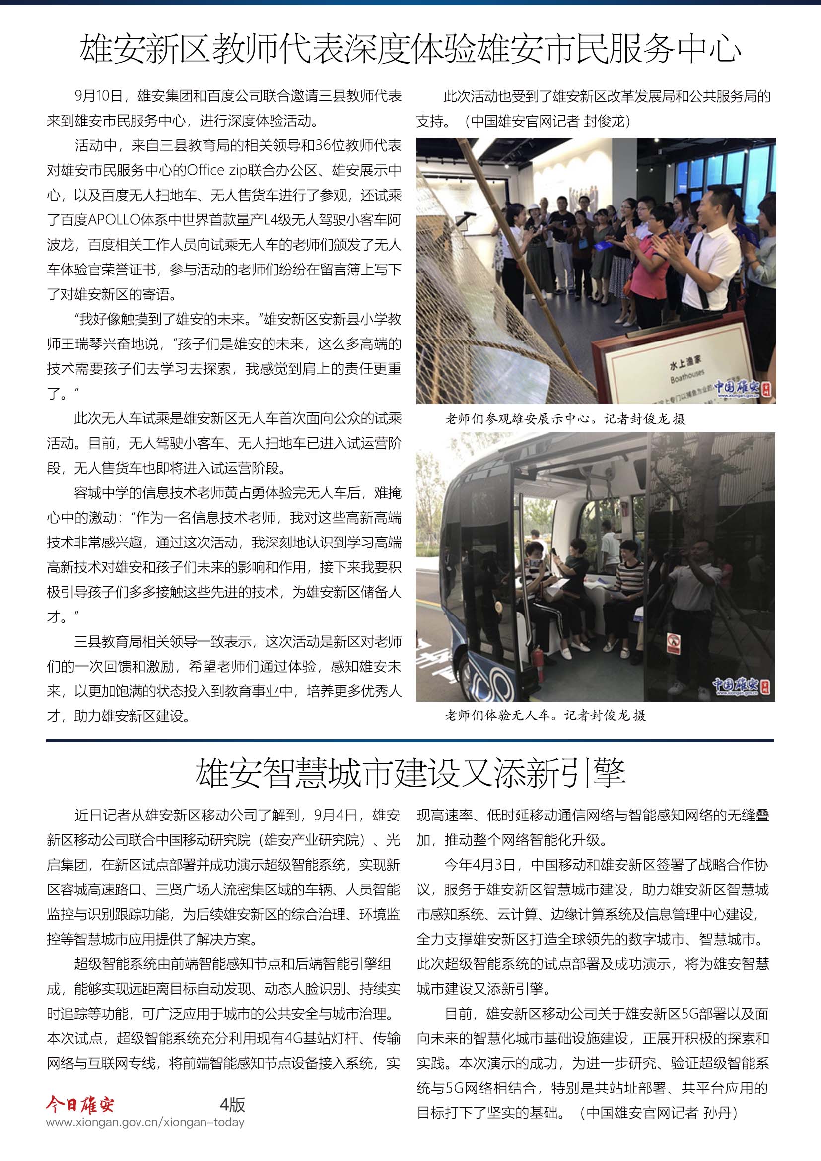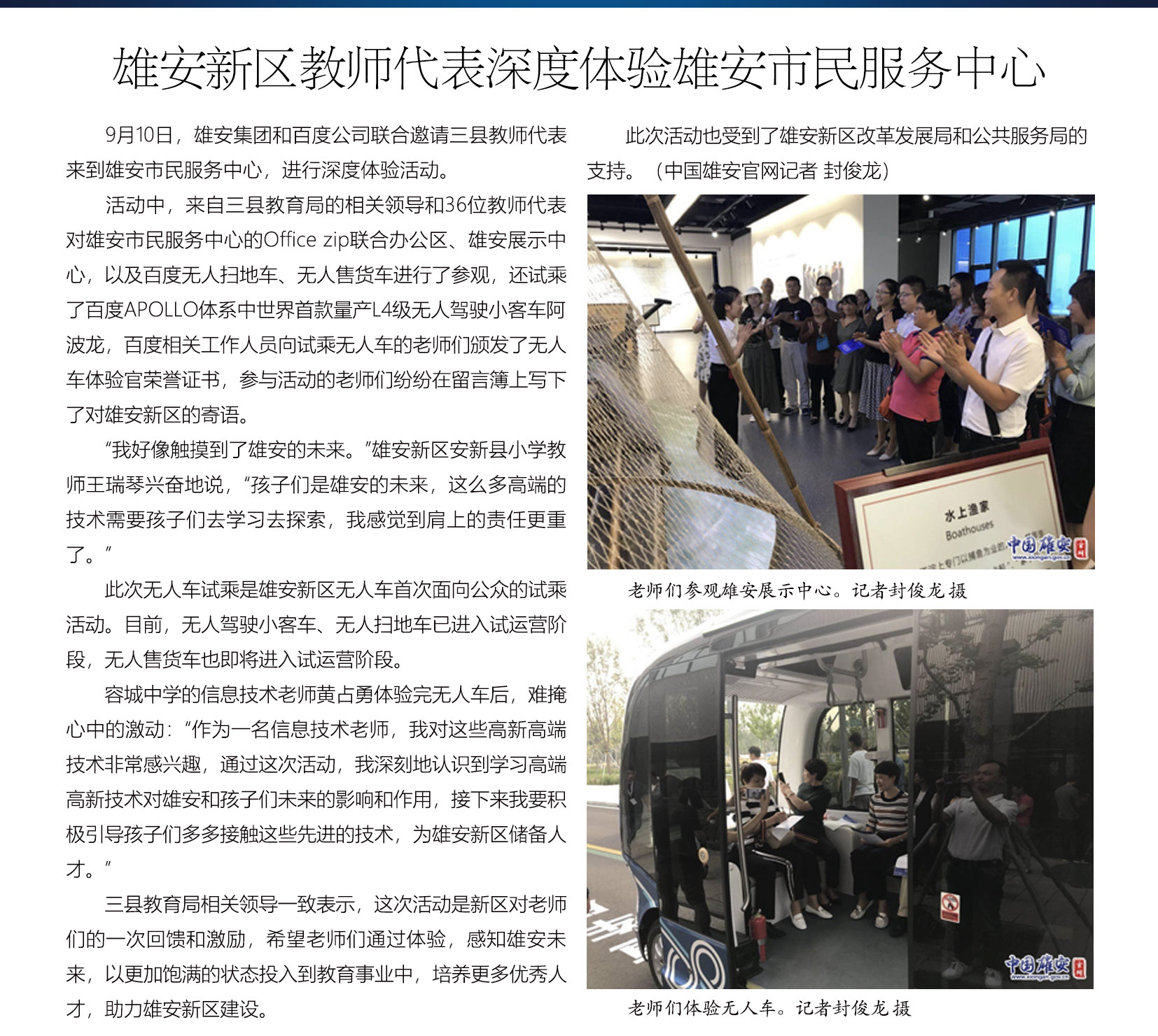 9月10日,雄安集团和百度公司联合邀请三县教师代表来到雄安市民服务中心,进行深度体验活动。