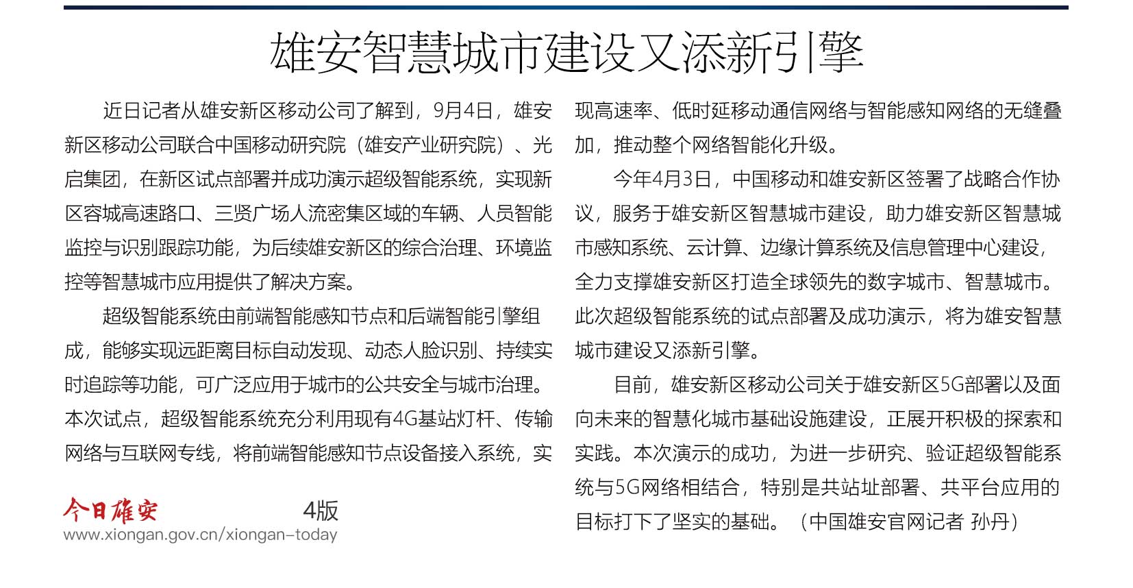 近日记者从雄安新区移动公司了解到,9月4日,雄安新区移动公司联合中国移动研究院(雄安产业研究院)、光启集团,在新区试点部署并成功演示超级智能系统。