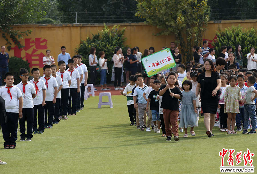 9月12日,北京市朝阳区实验小学雄安校区,身穿校服的高年级学生注视着一年级的小弟弟小妹妹们入场。当日,北京市朝阳区实验小学雄安校区举行2018----2019学年第一学期开学典礼。开学典礼的主题为“自主学习,幸福成长”。开学典礼上,有刚进入该校的365名一年级新生,这些“小豆包”们从幼儿园到小学,经历人生道路上的第一个转折点。今年3月1日,北京市援助雄安新区办学项目启动,北京市朝阳区实验小学雄安校区等四所学校正式挂牌成立。记者陈剑 摄