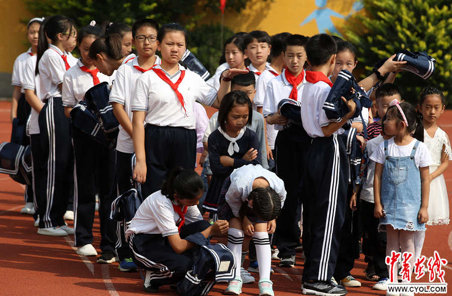 9月12日,北京市朝阳区实验小学雄安校区,一位高年级的学生为一年级的新生遮阳。当日,北京市朝阳区实验小学雄安校区举行2018----2019学年第一学期开学典礼。开学典礼的主题为“自主学习,幸福成长”。开学典礼上,有刚进入该校的365名一年级新生,这些“小豆包”们从幼儿园到小学,经历人生道路上的第一个转折点。今年3月1日,北京市援助雄安新区办学项目启动,北京市朝阳区实验小学雄安校区等四所学校正式挂牌成立。记者陈剑 摄