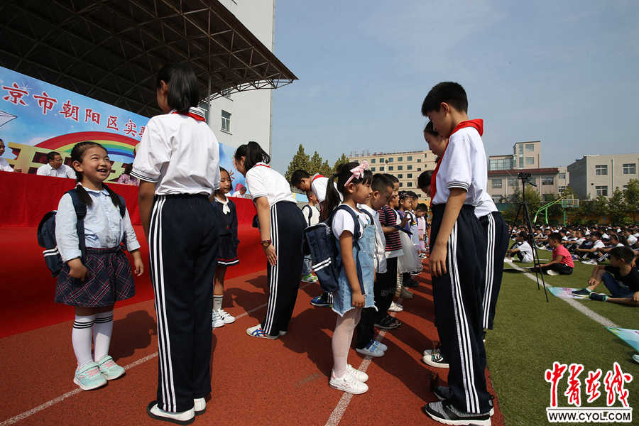 9月12日,北京市朝阳区实验小学雄安校区,高年级学生为一年级新生背上小书包后,双方互致问候。记者陈剑 摄