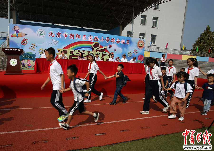 9月12日,北京市朝阳区实验小学雄安校区,一年级新生背上书包,跟随高年级的哥哥姐姐们退场。记者陈剑 摄