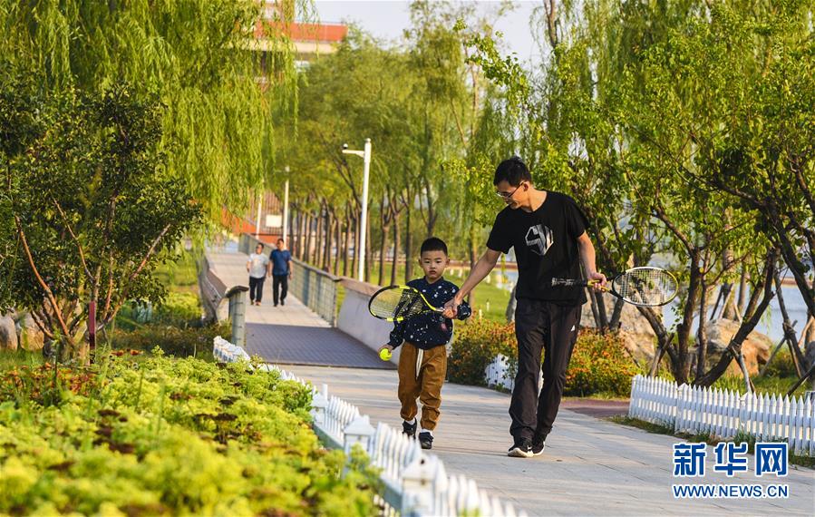河北省枣强县北湖公园原址曾是废弃多年的污水坑塘。2016年以来,枣强县在充分保留坑塘原有地貌、水系等自然风貌的基础上,通过实施水系连通、微地形处理、艺术景观植入等措施,在污水坑塘原址上建起了一个集湿地观光、生态园林为一体的生态公园,绿地率达76.64%,成为群众休闲游玩的好去处。新华社记者李晓果摄