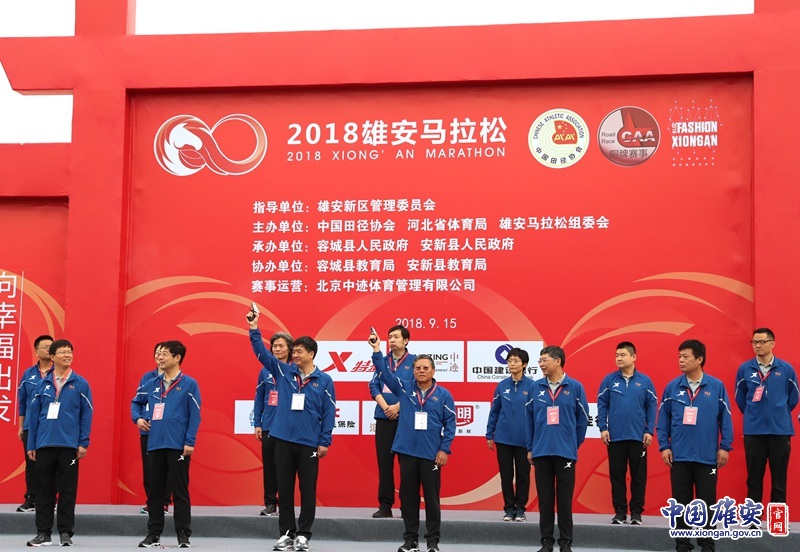 河北省委常委、副省长,雄安新区党工委书记、管委会主任陈刚(左起三),中国田径协会主席段世杰(左起四)为2018雄安马拉松鸣枪。记者崔利杰 摄
