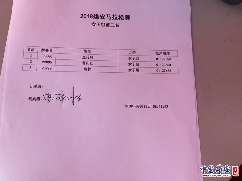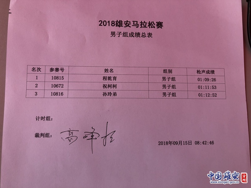 2018雄安马拉松参赛人数共5000人,其中半程马拉松2000人,健康跑3000人。其中,半程男子组程乾育获第一名、祝柯柯获第二名、孙玲弟获第三名(成绩精准到毫秒);半程女子组金玲玲获第一名,曹庆红获第二名,唐伟获第三名(成绩精准到毫秒)。