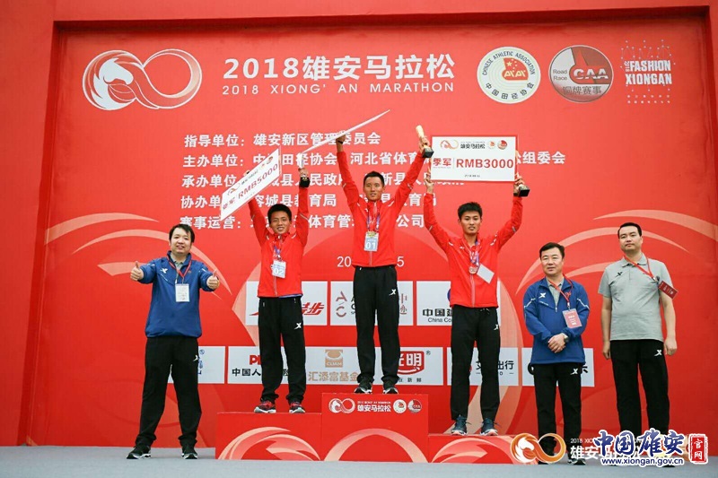 2018雄安马拉松半程男子组前三名站上领奖台。图片由雄安马拉松组委会提供