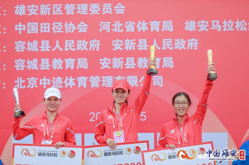 2018雄安马拉松半程女子组前三名站上领奖台。图片由雄安马拉松组委会提供