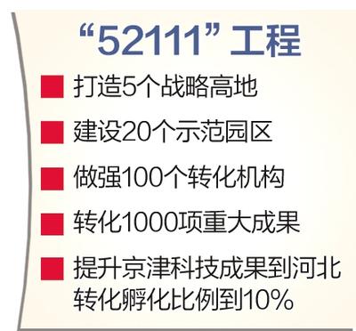 为推动“京津研发、河北转化”再提速,解决承接京津科技成果孵化转化的配套能力偏弱问题,近日,我省正式启动实施“52111”工程,聚焦科技成果孵化转化中心的协同创新战略定位,探索具有河北特色的科技成果转化路径。“‘52111’工程即打造5个战略高地、建设20个示范园区、做强百个转化机构、转化千项重大成果、提升京津科技成果到河北转化孵化比例到10%。”省科技厅相关负责人表示,到2020年,可带动全省技术合同交易总额达到500亿元,基本建成上下联动、横向协同、运行顺畅的技术转移体系。按照可量化、可检查、可问责要求,“52111”工程明确了7项主要任务——