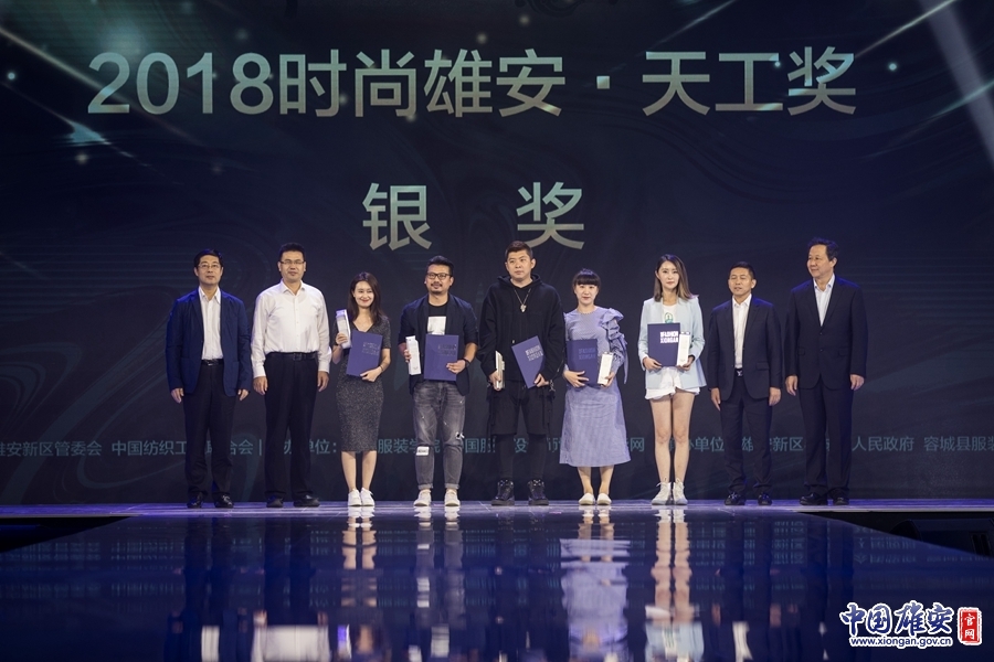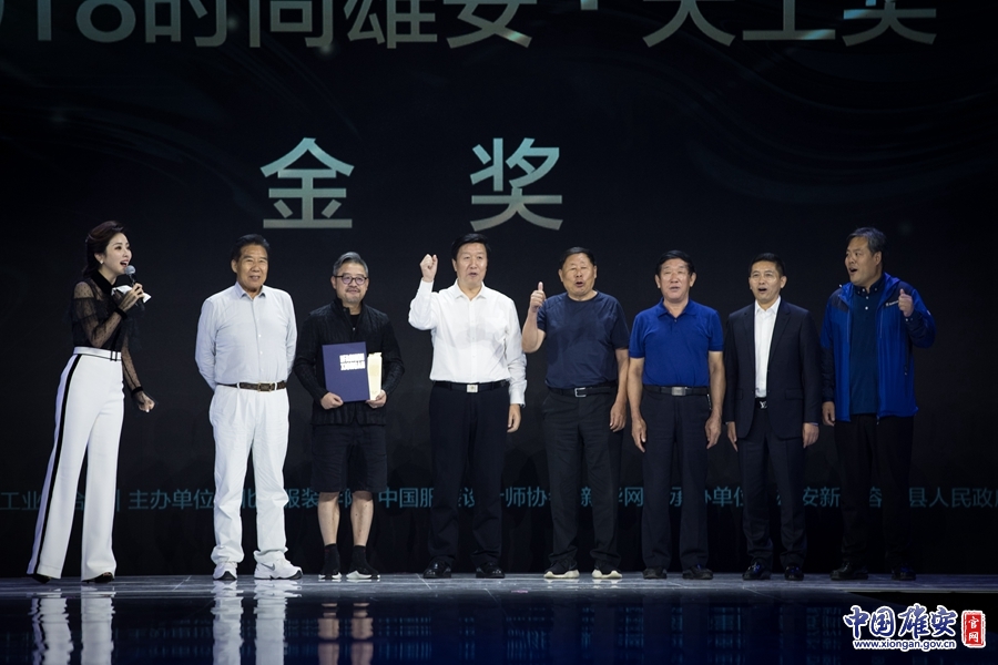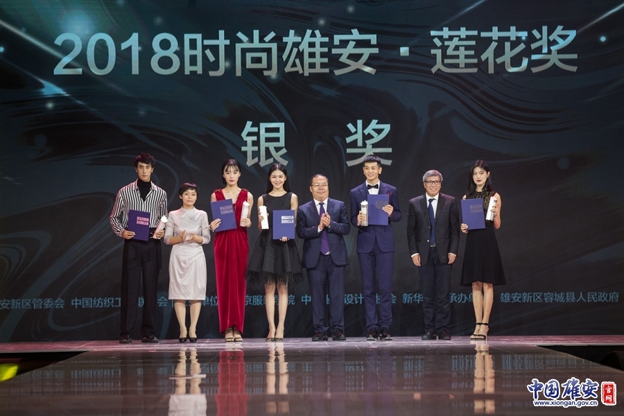 雄安新区党工委委员、管委会副主任傅首清,北京服装学院党委书记马胜杰,容城县服装商会会长、雄源集团董事长周艳成,保定来福汽车照明有限公司董事长杨利亚为2018时尚雄安·天工奖·银奖获奖者颁奖。中国雄安官网记者马梦迪 摄