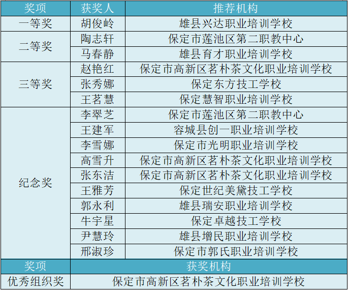 本次评选活动由新区综合执法局·土地储备中心和雄县、容城、安新县就业服务局联合主办,中国银行河北雄安分行协办,14所参与新区培训工作的定点职业学校、职业培训学校推荐了29名教师参加评选。经过专家评审,最终,雄县兴达职业培训学校的胡俊岭老师获得一等奖,保定市莲池区第二职教中心等五所学校的老师分获二三等奖(详见名单)。本活动旨在通过宣传、表彰培训机构中的优秀教师,带动所有培训机构不断提升教师素质和培训水平,扎实做好村民转市民这项长期的基础性工作,更快实现新区群众由村民向市民、向技工、向创客的转变。
