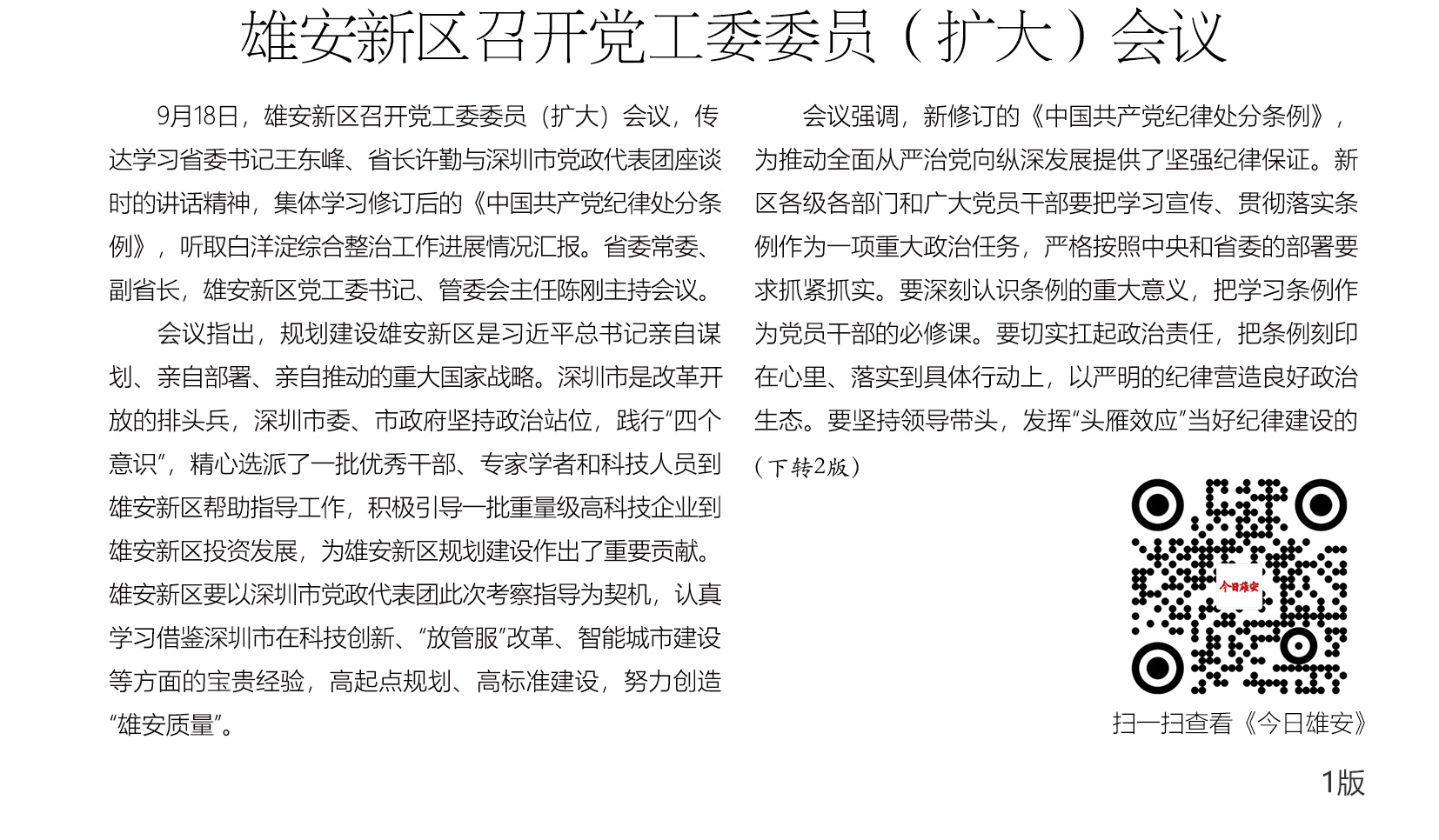 10月7日,省委书记、省人大常委会主任王东峰主持召开河北雄安新区规划建设领导小组会议,会议强调高标准高质量高效率推进雄安新区规划建设,举全省之力推动重大国家战略落地见效。