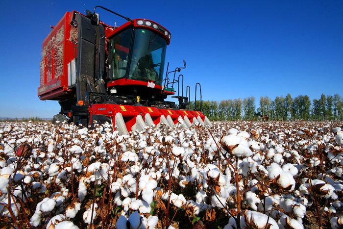 新疆生产建设兵团第五师八十九团11连的棉田里,一台大型采棉机正在采收棉花。新华网发 (汪铁锁 摄)