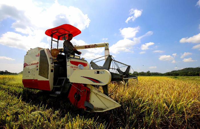 8月22日,江西省靖安县仁首镇石下村农民驾驶农机收割中稻。新华社发(徐仲庭 摄)