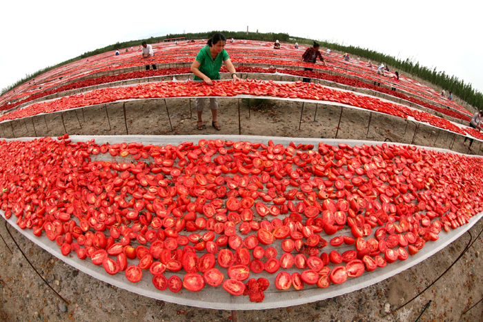 新疆兵团第二师二十九团职工正在晾晒刚刚收获的番茄。新华网发(杜炳勋 摄)