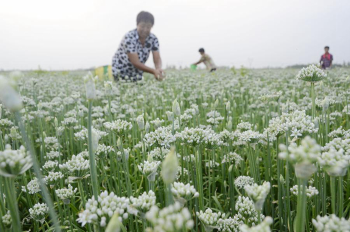 8月28日,在滨城区三河湖镇大营刘村乐旋自然蔬菜专业合作社韭菜基地,村民尹美英在采摘韭花。 新华社发(李荣新 摄)