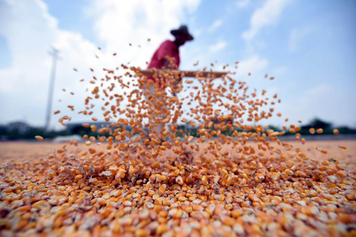 8月30日,山东省临沂市郯城县马头镇农民在晾晒玉米。新华社发(房德华 摄)