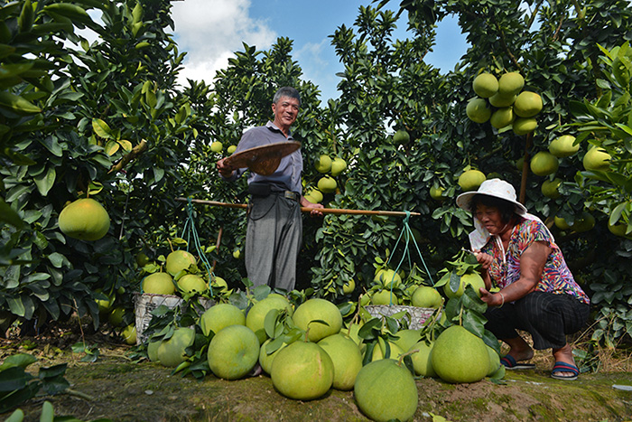 8月31日,在浙江玉环清港镇垟根村的文旦园里,早熟文旦挂满枝头,果农们忙着采摘。新华网发(施荣华 摄)