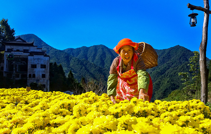 8月23日,在江西省婺源县篁岭村,村民正在采摘皇菊。新华网发(方华彬 摄)