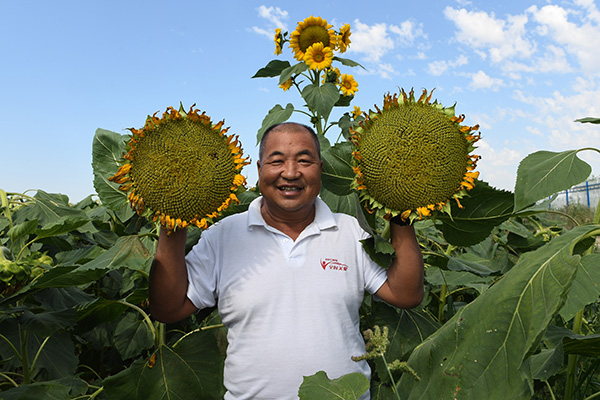 8月23日,内蒙古自治区五原县种植户张忠贵在自家的葵花地里。新华社记者 刘磊 摄