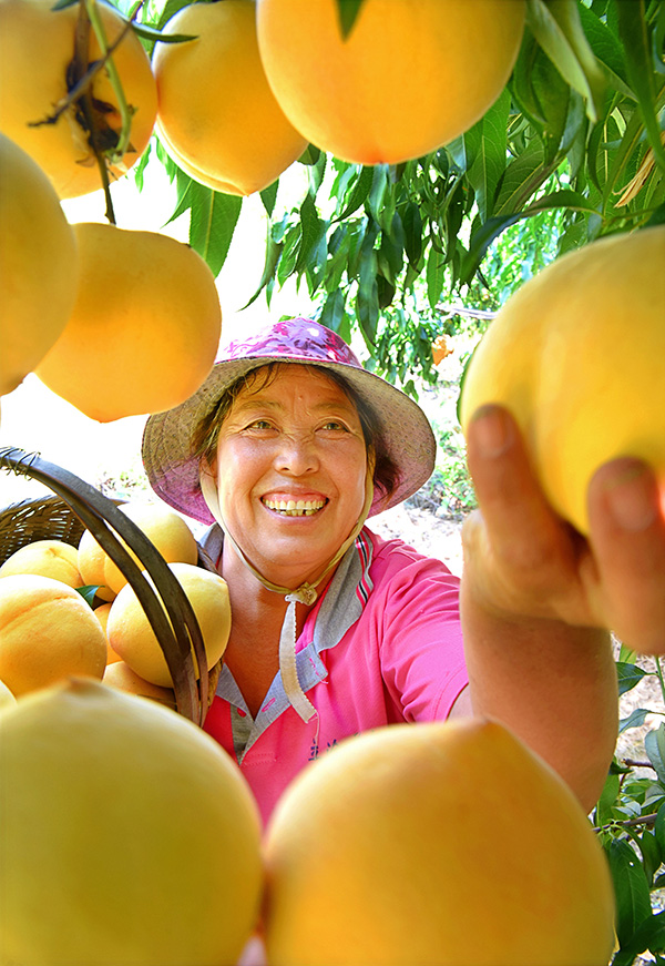 8月28日,山东省淄博市沂源县东里镇福禄坪村的果农在采摘黄桃。 新华社发(赵东山 摄)