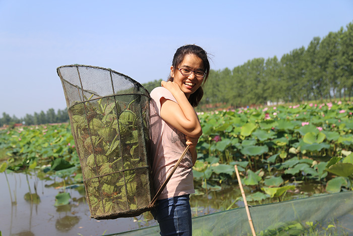 8月25日,湖北荆州洪湖市回乡创业青年王文娟在采莲藕。新华网发(连讯 摄)
