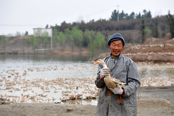 这是河南省光山县文殊乡杜槐村金合欢林茶专业合作社麻鸭养殖基地,务工农民在展示光山麻鸭。新华社记者 冯大鹏 摄