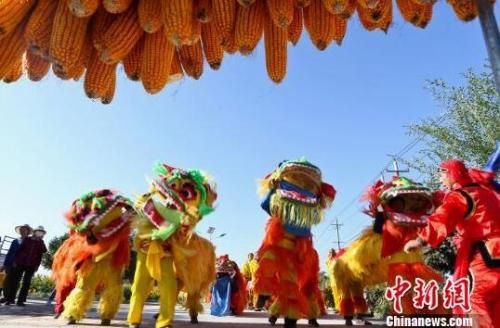 资料图:甘肃张掖明永镇村民们舞起祥狮迎接首届“中国农民丰收节”。王将 摄
