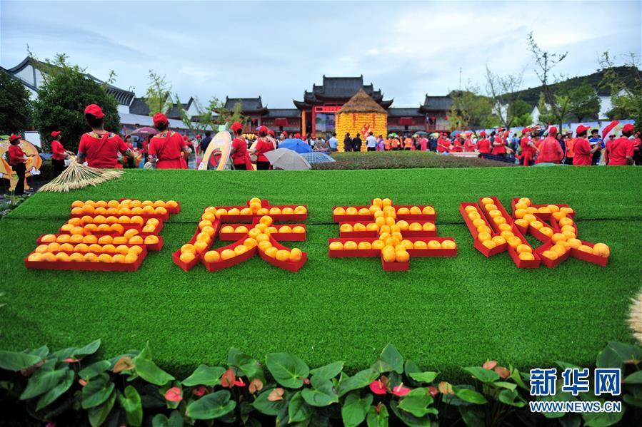9月21日,湖北省宜昌市夷陵区小溪塔街道官庄村举办首届“中国农民丰收节”暨第六届宜昌柑橘节,活动现场摆出由柑橘组成的“喜庆丰收”字样。新华社发(张国荣 摄)