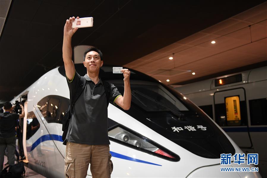 2018年9月23日,广深港高铁全线开通,搭乘G5711次高铁列车前往香港西九龙站的乘客在深圳北站拍照留念。新华社记者毛思倩 摄