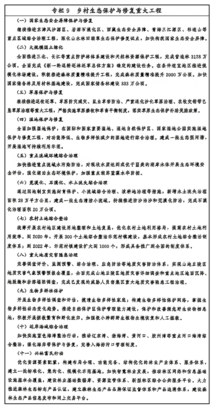 统筹山水林田湖草系统治理,优化生态安全屏障体系。大力实施大规模国土绿化行动,全面建设三北、长江等重点防护林体系,扩大退耕还林还草,巩固退耕还林还草成果,推动森林质量精准提升,加强有害生物防治。稳定扩大退牧还草实施范围,继续推进草原防灾减灾、鼠虫草害防治、严重退化沙化草原治理等工程。保护和恢复乡村河湖、湿地生态系统,积极开展农村水生态修复,连通河湖水系,恢复河塘行蓄能力,推进退田还湖还湿、退圩退垸还湖。大力推进荒漠化、石漠化、水土流失综合治理,实施生态清洁小流域建设,推进绿色小水电改造。加快国土综合整治,实施农村土地综合整治重大行动,推进农用地和低效建设用地整理以及历史遗留损毁土地复垦。加强矿产资源开发集中地区特别是重有色金属矿区地质环境和生态修复,以及损毁山体、矿山废弃地修复。加快近岸海域综合治理,实施蓝色海湾整治行动和自然岸线修复。实施生物多样性保护重大工程,提升各类重要保护地保护管理能力。加强野生动植物保护,强化外来入侵物种风险评估、监测预警与综合防控。开展重大生态修复工程气象保障服务,探索实施生态修复型人工增雨工程。