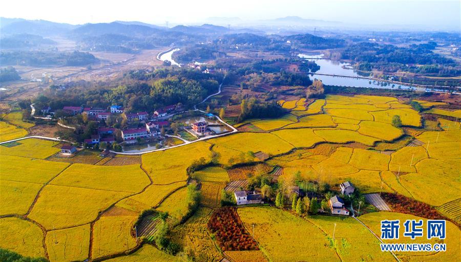 安徽省舒城县棠树乡八里村的稻田和民居(2017年11月3日摄)。新华社记者陶明摄