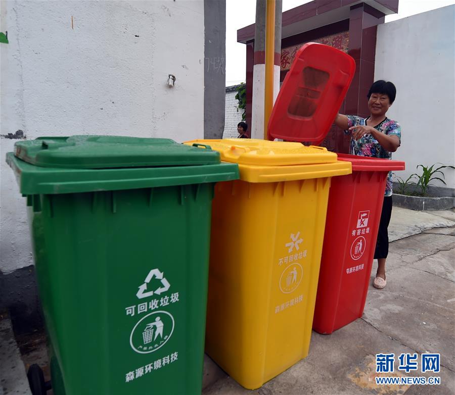 河南省禹州市火龙镇刘沟村的村民在使用分类垃圾箱(2018年6月26日摄)。 新华社发(李嘉南摄)