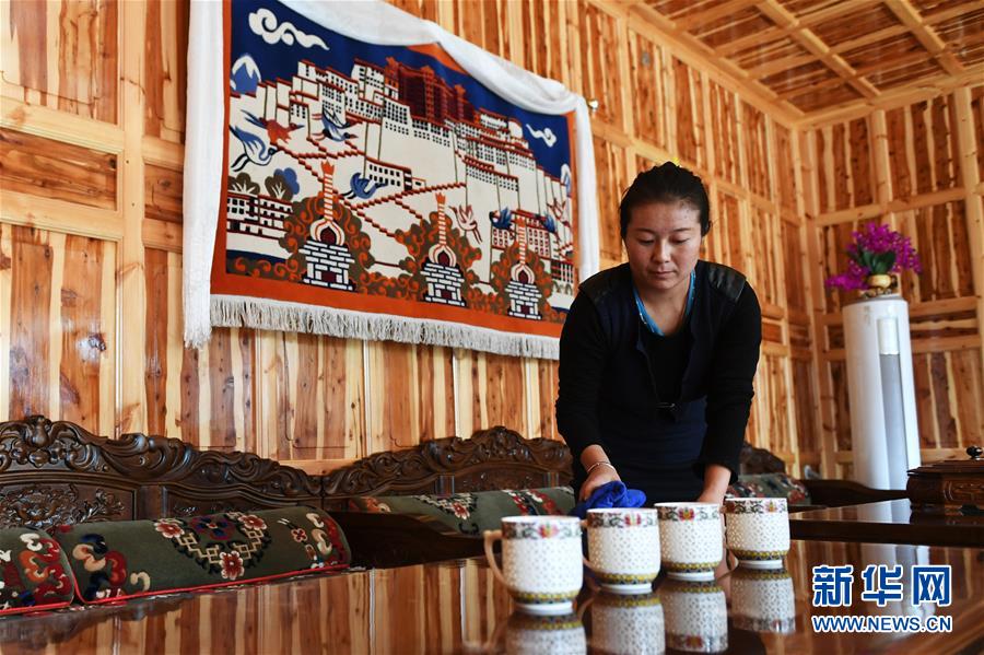甘肃甘南藏族自治州夏河县曲奥乡香告村村民卓玛才让在自家开办的藏家乐里打扫卫生(2017年10月12日摄)。 新华社记者陈斌摄