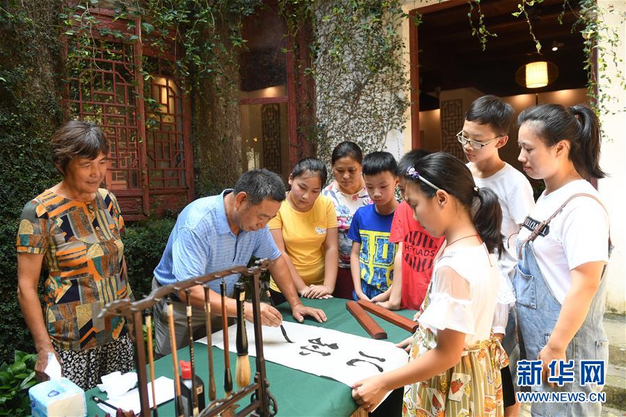 在浙江省湖州市吴兴区道场乡施家桥村乡村振兴讲习所,书法老师在家风家训课上教青少年书法(2018年8月29日摄)。 新华社记者翁忻旸摄