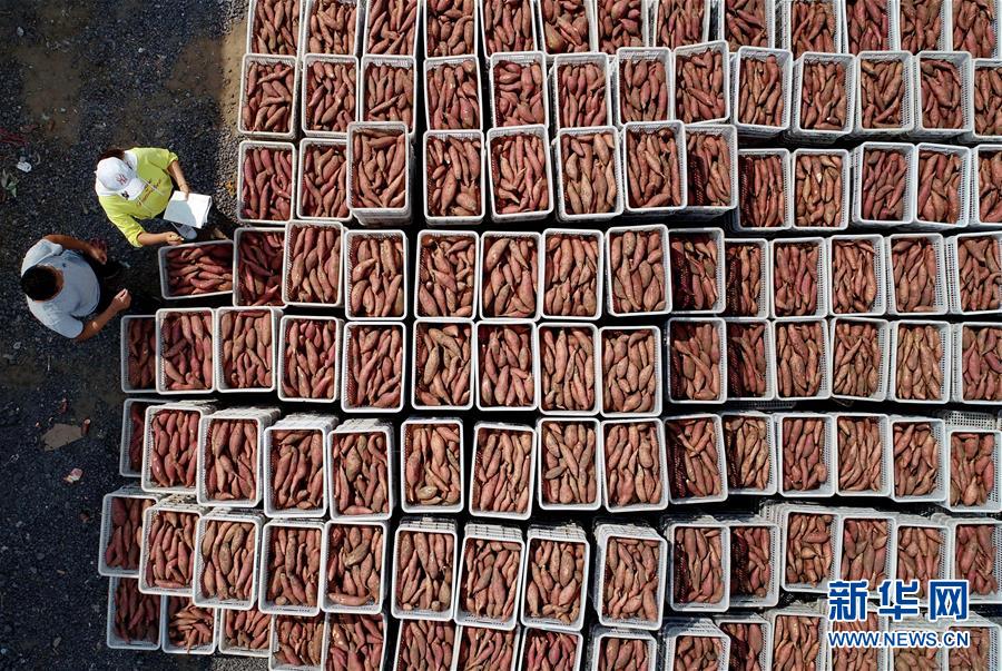 河北省滦南县东黄坨镇新户村农民在清点收获的红薯(2018年9月13日无人机拍摄)。 新华社记者杨世尧摄