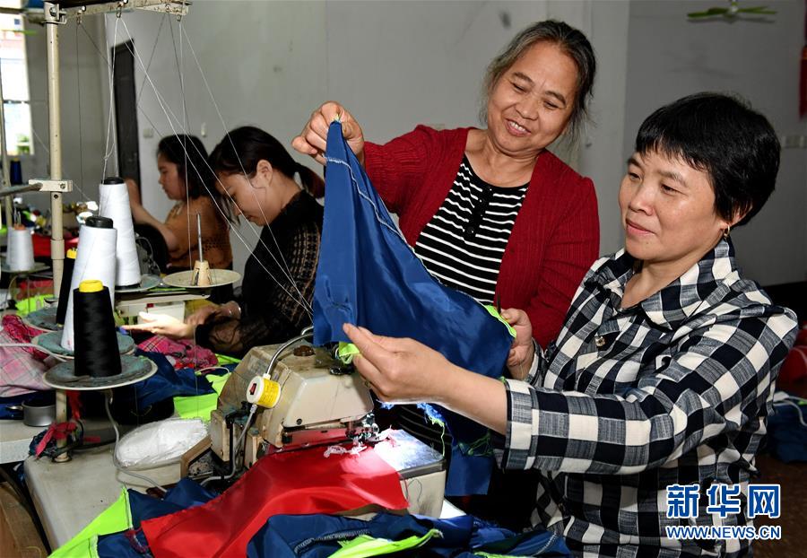 搬迁到福建省南平市浦城县山下乡小溪新村居住的毛信英 (右)在村服装加工厂工作(2018年6月4日摄)。从海拔近800米的沈厝自然村搬迁到小溪新村,毛信英一家靠卖土特产和打零工家庭年收入可达6万元。 新华社记者张国俊摄