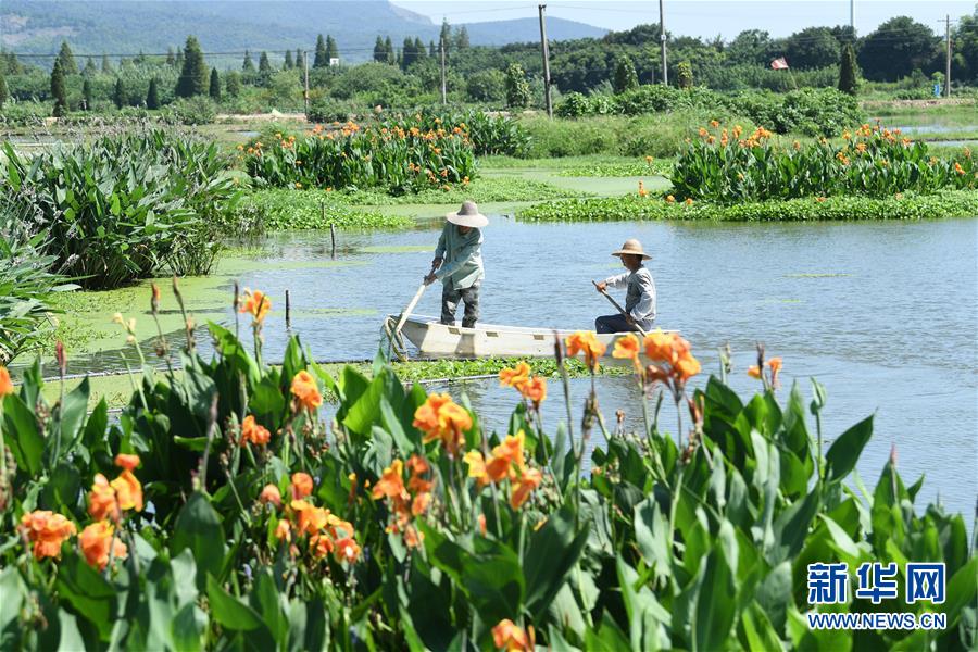在浙江省湖州市吴兴区道场乡红里山村,工作人员在养殖尾水处理功能区生物净化池清理水体(2018年8月29日摄)。 新华社记者翁忻旸摄
