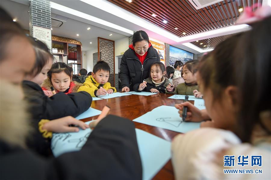 在江苏省江阴市周庄镇山泉村社区综合服务中心,小朋友在老师的带领下画画(2018年3月8日摄)。 新华社记者李博摄