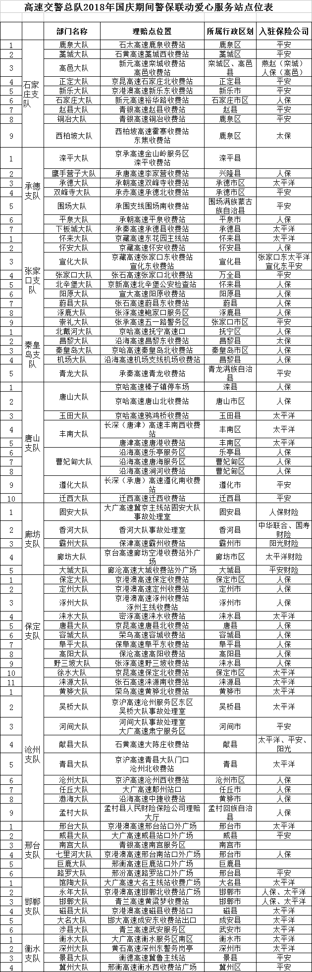 “警保联动”是保险公司理赔员与交警共同上路巡查的新模式,充分发挥保险公司在事故车辆勘验、定损和理赔上的专业优势,通过提高额度,简化事故定损、理赔服务手续,全面推行“互碰自赔”“互碰快赔”“代位求偿”等新举措。实现简易交通事故快处、快赔、快撤,缓解道路交通压力,有效减少和防范因事故造成的交通拥堵及次生事故,提高交通事故处理效率,提升人民群众的获得感和幸福感。国庆假期高速交警联合保险协会和各保险公司在省界主线站、地级市站口、流量大的服务区等部位设立90个“警保联动爱心服务站”,人保财险驻点33个、太平洋财险驻点26个、平安财险驻点21个,其它保险公司10个(具体站点分布见后)。